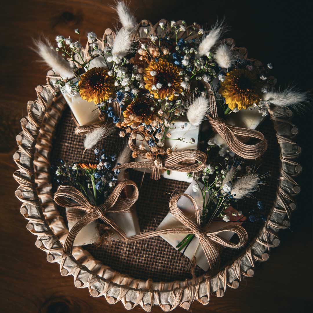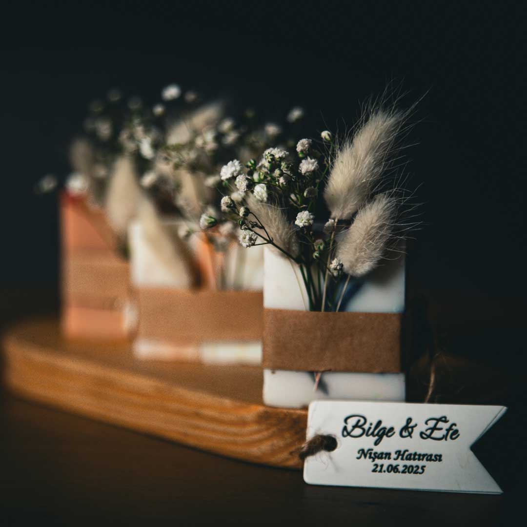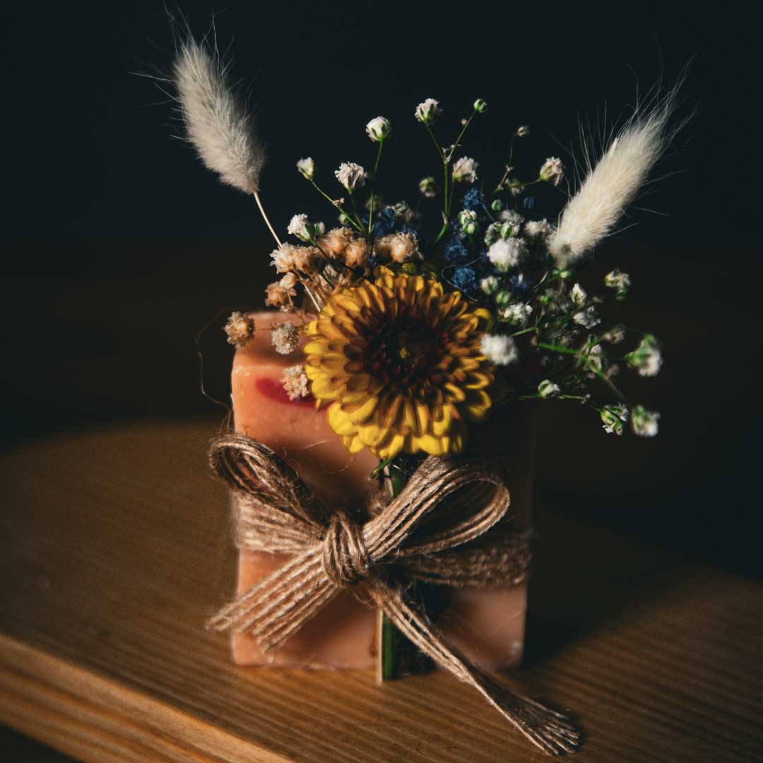 🌸 Üzerine eklenen kuru ya da canlı çiçekler, sabunun doğallığını görsel estetikle buluşturuyor. (Canlı çiçek seçeneğinde ek ücret uygulanabilir.)